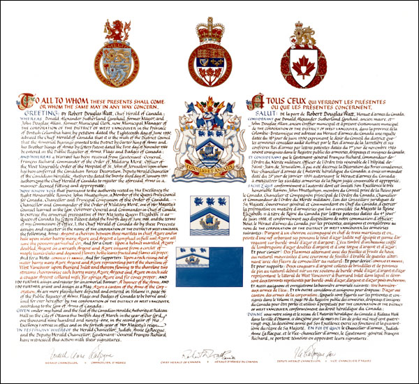 SupportsBlasonDeux couguars d'argent colletés de brindilles et de pommes de pin au naturel debout sur un roc soutenu de burelé-ondé d'azur, d'argent et d'azur représentant le littoral de West Vancouver à Burrard Inlet dans lequel se déversent deux torrents représentés par burelé-ondé d'azur, d'argent et d'azur posés en chevron; |