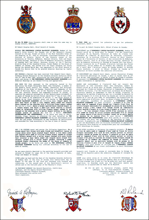 Armoiries de Lincoln MacCauley AlexanderBlasonD'argent à un lion de sable armé et lampassé d'azur chargé sur l'épaule d'une fleur de trille d'argent boutonnée d'or accompagné en pointe de deux burèles ondées d'azur; SymbolismeLe lion noir représente les origines ancestrales de Son Honneur et symbolise la force et la sagesse. Les vagues bleues rappellent les eaux du lac Ontario près de Toronto, la ville natale de Son Honneur, et celles de la mer des Caraïbes bordant la Jamaïque et Saint-Vincent, lieux d’origine de ses parents. Le trille est l’emblème floral de l’Ontario. |