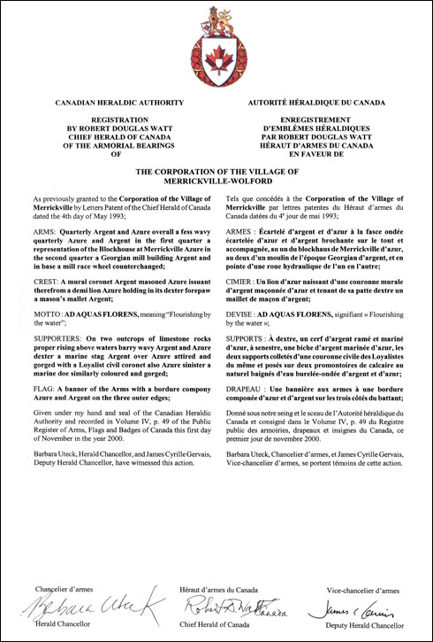 Autres renseignementsLes emblèmes du récipiendaire ont été précédemment consignés au nom du Corporation of the Village of Merrickville dans le Registre public des armoiries, drapeaux et insignes du Canada, volume II, page 234, le 4 mai 1993. |