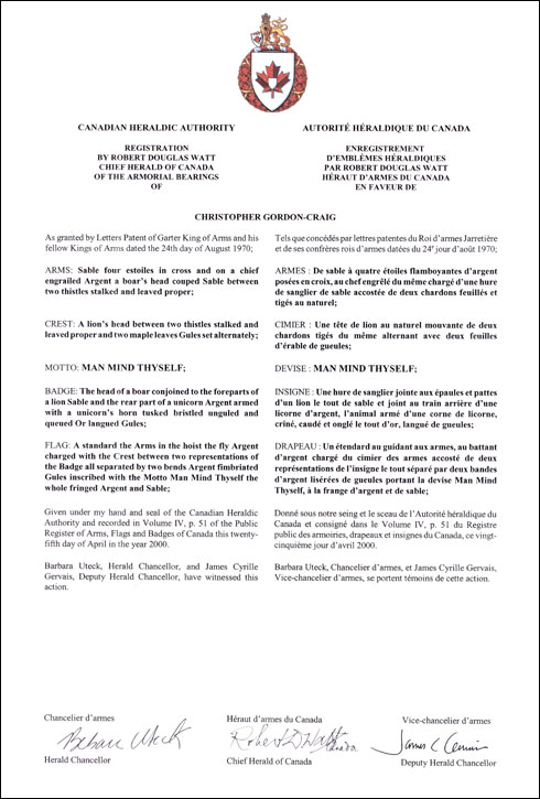 Armoiries de Christopher Gordon-CraigBlasonDe sable à quatre étoiles flamboyantes d'argent posées en croix, au chef engrêlé du même chargé d'une hure de sanglier de sable accostée de deux chardons feuillés et tigés au naturel; SymbolismeNon disponible. |