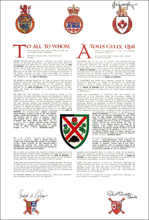 Armoiries de la Banque de MontréalBlasonD'argent au sautoir de gueules accompagné en chef d'une rose du même barbée, boutonnée, feuillée et tigée, en pointe d'un castor contourné, à dextre d'un chardon feuillé et tigé et à senestre d'un trèfle feuillé de trois pièces le tout au naturel, à la bordure partie de sable et de sinople; |