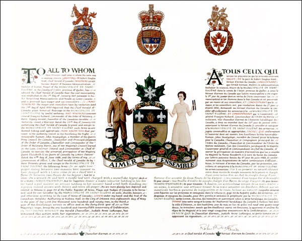 Armoiries de la Municipalité de Saint-EugèneBlasonD'or à un pommier au naturel s'élevant entre deux monts de sinople mouvants de la pointe et chargés d'une croix latine d'or, au chef de sinople chargé d'une flamme d'or accostée de deux fleurs de lis d'argent; |