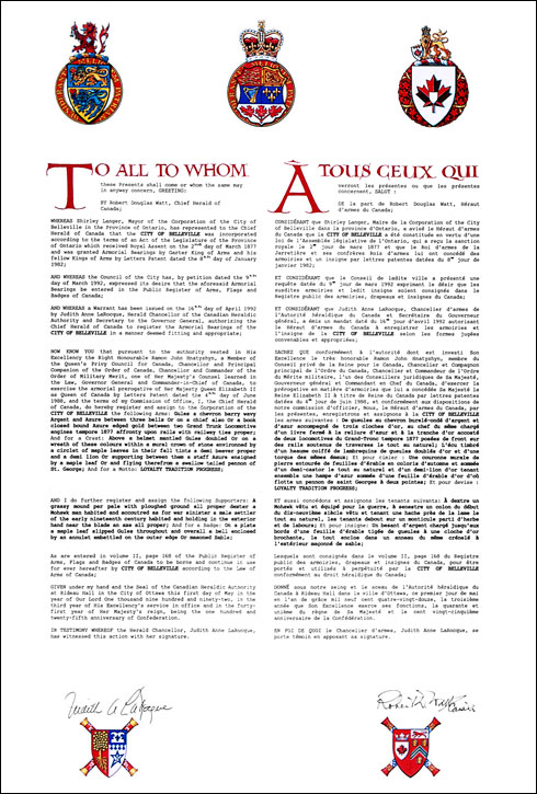 Armoiries de la City of BellevilleBlasonDe gueules au chevron burelé-ondé d'argent et d'azur accompagné de trois cloches d'or, au chef du même chargé d'un livre fermé à la reliure d'azur et à la tranche d'or accosté de deux locomotives du Grand-Tronc tempore 1877 posées de front sur des rails soutenus de traverses le tout au naturel; |