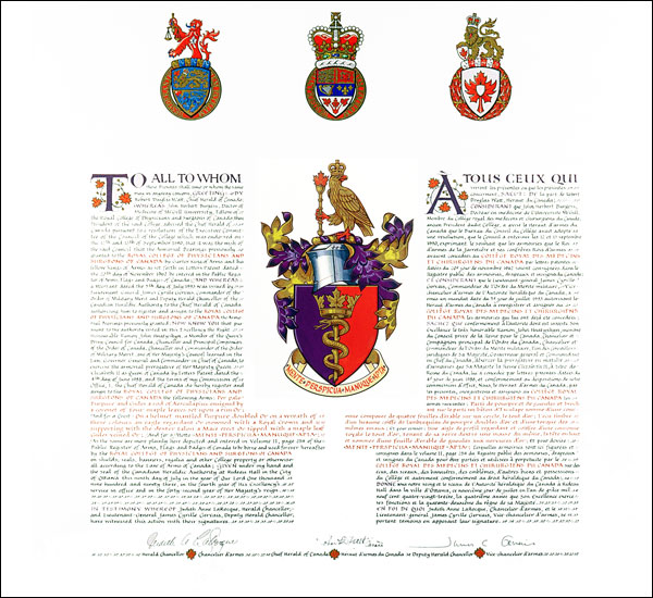 Informations additionnellesCréateur(s)Concept original d’Alan Beddoe et des hérauts du Collège d’armes, Londres. Artiste-peintreGordon Macpherson CalligrapheJudith Bainbridge Type de récipiendaireInstitution civile