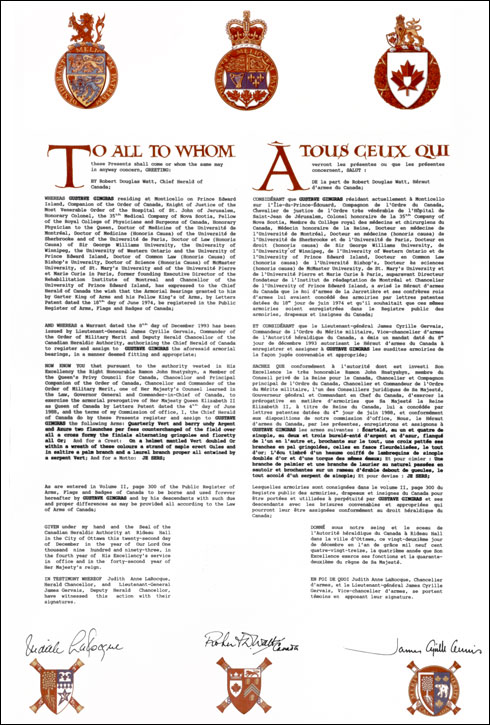 L'utilisation du contenu du Registre public est réservée à des fins de recherche uniquement. Les emblèmes héraldiques du Registre ne peuvent être reproduits sous aucune forme ou par quelque procédé que ce soit sans l'autorisation écrite de l'Autorité héraldique du Canada et/ou du récipiendaire.