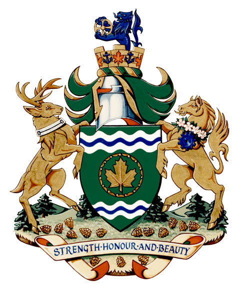 SupportsBlasonA dextre, un cerf portant un collier de wampum des Mississagues au naturel; à senestre, une jument d'or colletée de fleurs de pommier feuillées de sinople d'où pend une roue d'engrenage d'azur, les supports debout sur un mont formé de trois collines boisées de sinople ornées de pommes de pin d'or; |