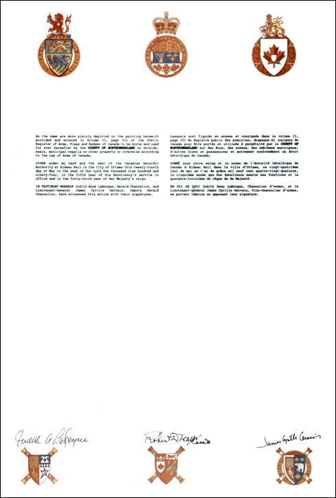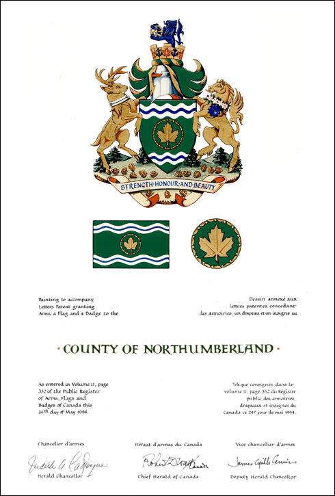 Armoiries du County of NorthumberlandBlasonDe sinople à une feuille d'érable d'or enclose dans un cercle de quinze fruits de l'érable du même, le tout accompagné de deux burèles ondées d'argent, l'une en chef, l'autre en pointe, chargées chacune d'un filet ondé d'azur; |