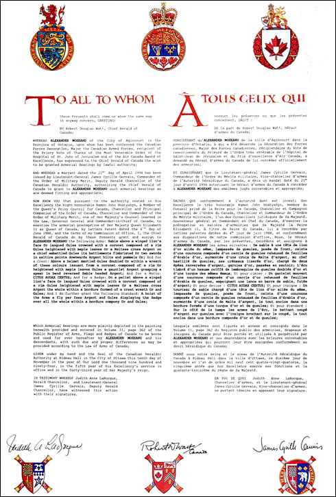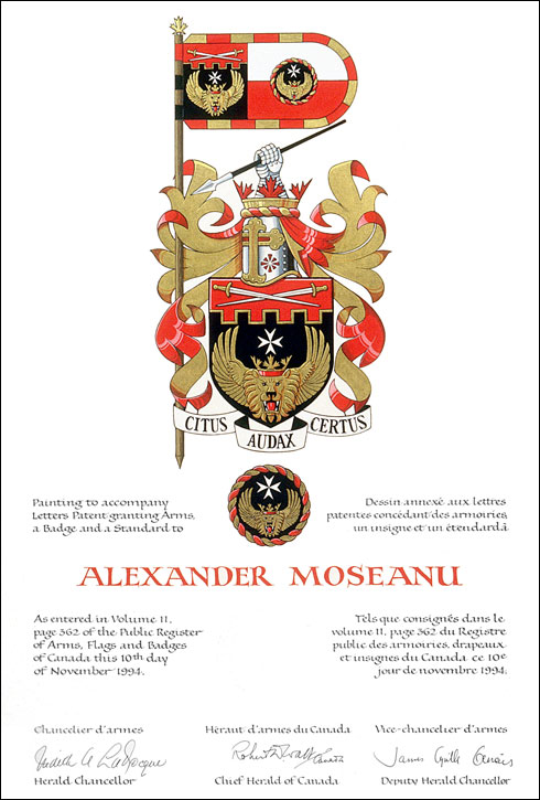 Informations additionnellesCréateur(s)Concept original d'Alexander Moseanu, assisté par les hérauts de l’Autorité héraldique du Canada. Artiste-peintreRobert Létourneau CalligrapheSuzzann Wright Type de récipiendaireIndividuel |