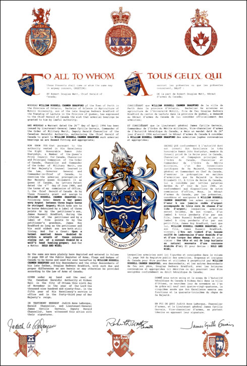 Concession d’armoiries, avec brisures à James Russell Bradford et à James Roy Bradford