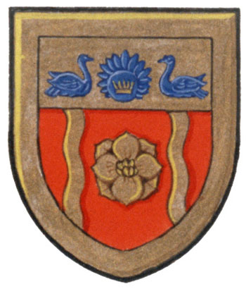 Armoiries de Chunilal RoyBlasonDe gueules à la fleur de lotus accostée de deux vergettes ondées, le tout d'or, au chef du même chargé de la couronne Chakra (Sahasrana) d'azur surchargée d'une couronne à l'antique d'or, accostée de deux cygnes nageant affrontés d'azur; SymbolismeLe dessin illustre l’expérience spirituelle du Dr Roy. La fleur de lotus symbolise la contemplation. Les lignes ondulées d’or représentent les canaux nerveux, Ida et Pingala, qui sont des concepts d’énergie en yoga tantrique. La section centrale représente la Sushumna dans laquelle l’énergie vitale de la Kundalini est attirée vers le haut au moyen d’exercices religieux et de méditation, sa destination étant le Chakra coronal où se réalise l’entière illumination spirituelle. Les cygnes représentent le temps séjourné par le Dr Roy dans un monastère védantique. |