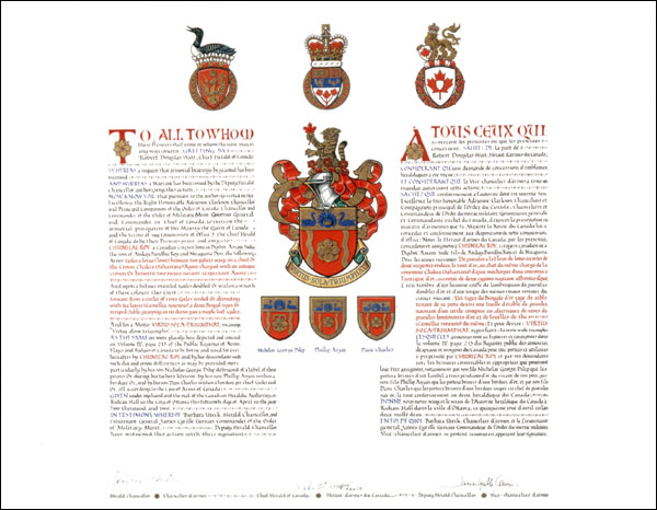 Informations additionnellesCréateur(s)Concept original de Graham Anderson, héraut Cowichan extraordinaire, assisté par les hérauts de l'Autorité héraldique du Canada Artiste-peintreGordon Macpherson CalligrapheKaren Mackay Type de récipiendaireIndividuel |