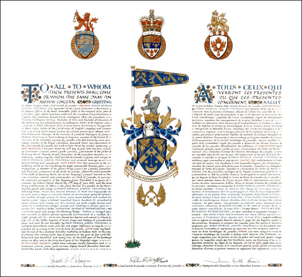 Informations additionnellesCréateur(s)Concept original de David Tysowski, assisté par les hérauts de l’Autorité héraldique du Canada. Artiste-peintreDebra Parker CalligrapheJudith Bainbridge Type de récipiendaireIndividuel |