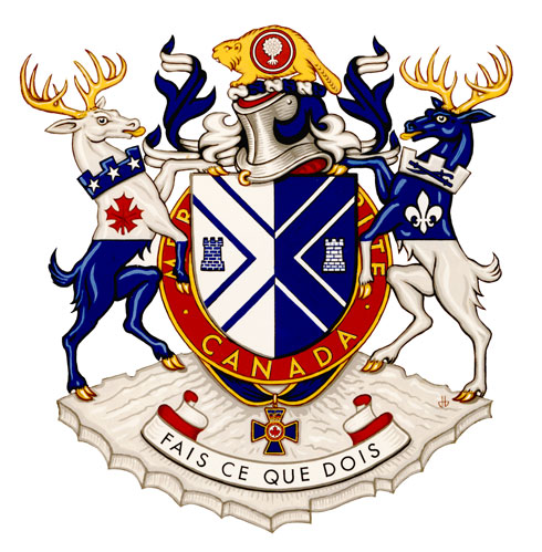 SupportsBlasonÀ dextre un cerf coupé d’argent sur azur ramé et onglé d’or et colleté d’une couronne murale d’azur chargée de six étoiles d’argent dont trois visibles et portant sur l’épaule une feuille d’érable de gueules, à senestre un cerf coupé d’azur sur argent ramé et onglé d’or colleté d’une couronne murale d’argent chargée d’une représentation de deux insignes d’un lieutenant général des Forces armées canadiennes d’azur dont une visible et portant sur l’épaule une fleur de lis d’argent; les supports soutenus par une représentation du rocher de la ville de Québec au naturel; |