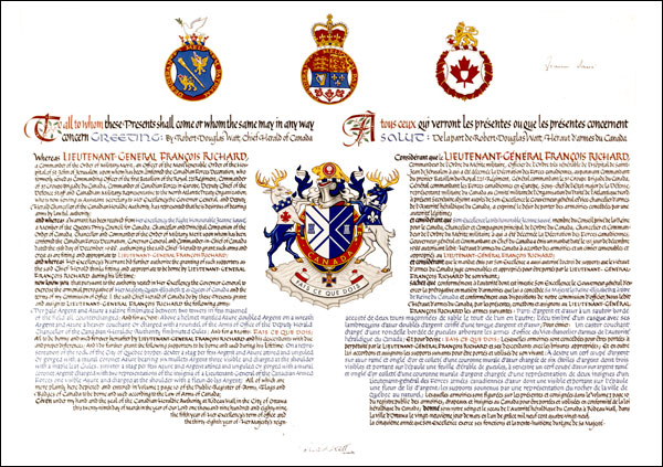 Informations additionnellesCréateur(s)Concept original de Robert D. Watt, héraut d'armes du Canada, assisté par les hérauts de l'Autorité héraldique du Canada. Artiste-peintreHans Birk CalligrapheAlf Ebsen Type de récipiendaireIndividuel |