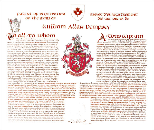 Armoiries de William Allan DempseyBlasonDe gueules au léopard lionné d’argent chargé sur l’épaule d’une tiercefeuille tigée de sinople et accosté de deux épées au naturel garnies d’or posées en pile le tout accompagné de trois feuilles d’érable d’or; |