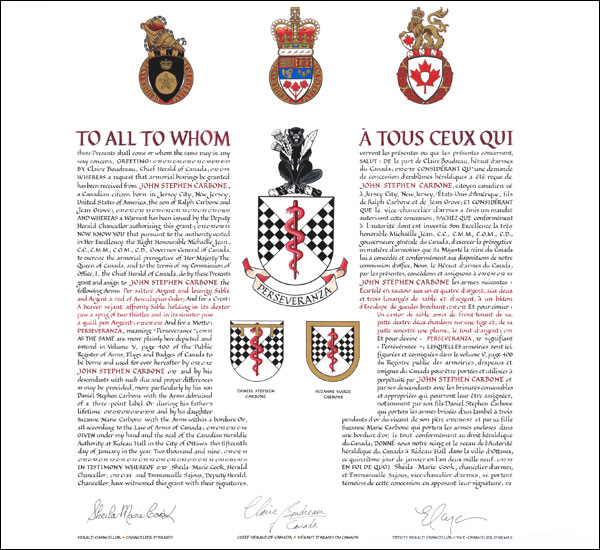 Concession d’armoiries, avec brisures à Daniel Stephen Carbone et à Suzanne Marie Carbone