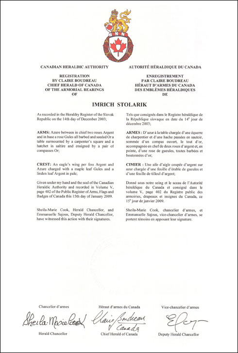 Armoiries d'Imrich StolarikBlasonD’azur à la table chargée d’une équerre de charpentier et d’une hache passées en sautoir, sommée d’un compas ouvert, le tout d’or, accompagnée en chef de deux roses d’argent et, en pointe, d’une rose de gueules, toutes barbées et boutonnées d’or; SymbolismeLes outils de menuisier évoquent l’occupation des ancêtres de M. Stolarik à l’époque où ils ont acquis le patronyme Stolarik au 16e siècle. Les trois roses rappellent le comté de Turiec en Slovaquie centrale, lieu de résidence de la famille dans les années 1930 et 1940. |