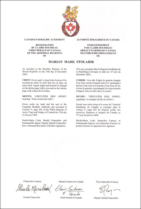 Cimier de Marian Mark StolarikBlasonUne aile d’aigle de gueules chargée d’un livre ouvert d’argent relié d’or surchargé à dextre d’une rose et à senestre d’une fleur de lis, le tout de gueules, accompagné de cinq écussons d’argent, trois en chef, deux en pointe; SymbolismeLe livre ouvert orné d’une rose de Turiec et d’une fleur de lis représente la chaire d’histoire et de culture slovaques que détient le professeur Stolarik à l’Université d’Ottawa. Les écussons sont repris des armoiries de l’Université d’Ottawa, tandis que l’aile d’aigle est reprise du cimier de Zdenko Alexy, composé de deux ailes d’aigle. |