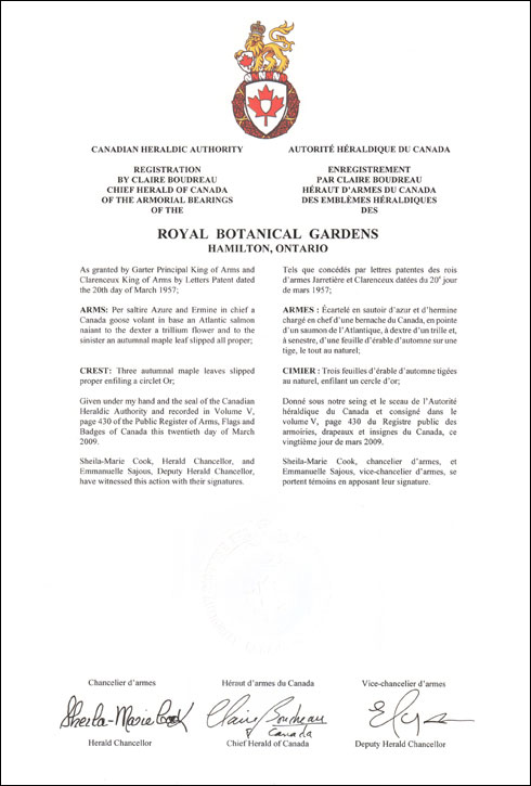 Armoiries des Royal Botanical GardensBlasonÉcartelé en sautoir d’azur et d’hermine chargé en chef d’une bernache du Canada, en pointe d’un saumon de l’Atlantique, à dextre d’un trille et, à senestre, d’une feuille d’érable d’automne sur une tige, le tout au naturel; SymbolismeLa bernache du Canada en vol représente les nombreux oiseaux migrateurs qui ont pour habitat les sanctuaires naturels des Royal Botanical Gardens. Le saumon de l’Atlantique rappelle les saumons qui frayaient autrefois dans les affluents du lac Ontario et dans les marécages à l’intérieur des jardins botaniques. Le trillium, un des emblèmes de la province de l’Ontario, symbolise les nombreuses variétés de fleurs sauvages qui poussent dans ces jardins. La feuille d’érable représente les Royal Botanical Gardens ainsi que les paysages et les divers peuples du Canada. |