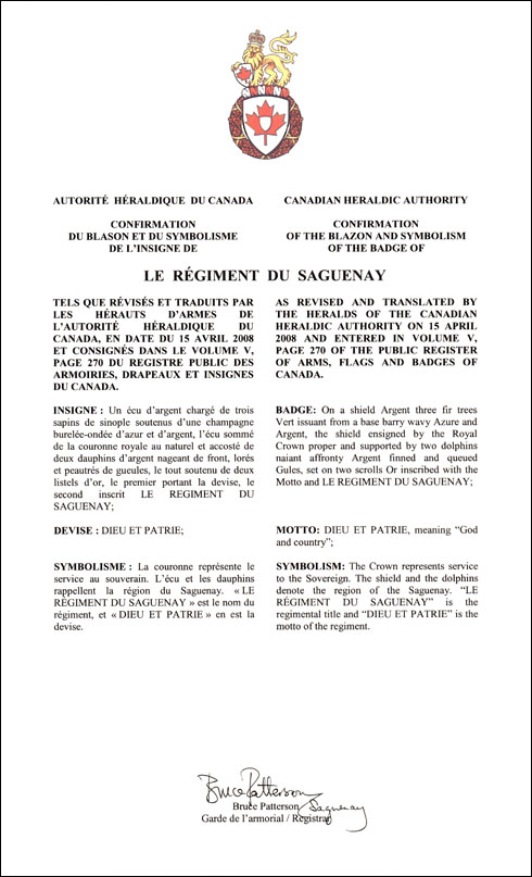 Insigne de Le Régiment du SaguenayBlasonUn écu d’argent chargé de trois sapins de sinople soutenus d’une champagne burelée-ondée d’azur et d’argent, l’écu sommé de la couronne royale au naturel et accosté de deux dauphins d’argent nageant de front, lorés et peautrés de gueules, le tout soutenu de deux listels d’or, le premier portant la devise, le second inscrit LE REGIMENT DU SAGUENAY; SymbolismeLa couronne représente le service au souverain. L’écu et les dauphins rappellent la région du Saguenay. « LE RÉGIMENT DU SAGUENAY » est le nom du régiment, et « DIEU ET PATRIE » en est la devise. |