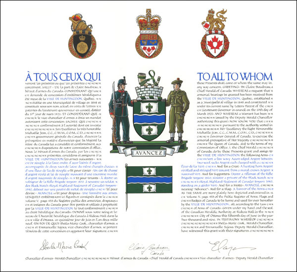 SupportsBlasonÀ dextre un voltigeur de la Rifle Brigade tempore 1870, à senestre un soldat des Black Watch (Royal Highland Regiment of Canada) tempore 1940, debout sur une poutre de métal de sinople; SymbolismeLe soldat de la Rifle Brigade évoque la menace d’invasion des Fenians en 1866 et 1870, lorsque des troupes de la garnison de Montréal se sont joints à la milice locale, les Huntingdon Borderers, afin de contrer les raids provenant de l’État de New York. Il honore également le prince Arthur (futur duc de Connaught), troisième fils de la reine Victoria, qui fut un lieutenant de la Rifle Brigade et qui était stationné à Montréal en 1870. Il se rendit à Huntingdon afin de saluer la victoire des troupes locales suite à leur victoire à la rivière Truite et y retourna une cinquantaine d’années plus tard, après avoir servit en tant que gouverneur général du Canada. Le soldat du régiment du Black Watch (Royal Highland Regiment of Canada) évoque la création d’un centre d’entraînement de l’armée à Huntingdon lors de la Seconde Guerre mondiale, où les officiers et les sous-officiers du régiment ont entraîné les premiers cadres. La ville d’Huntingdon attribua, pour cette raison, au Black Watch le droit de cité. La poutre verte en acier représente le pont Walker, qui a longtemps réuni la rive de Huntingdon et celle des cantons de Godmanchester et Hinchinbrooke. |