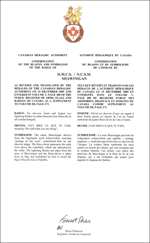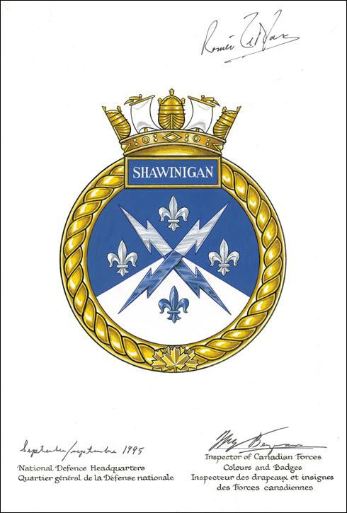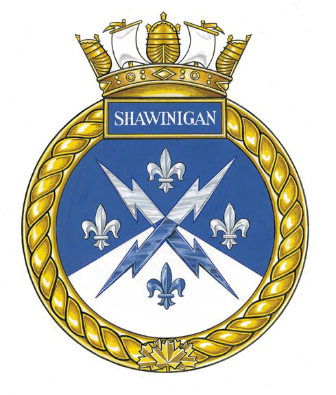 Insigne du N.C.S.M. ShawiniganBlasonDivisé en chevron d’azur sur argent à deux éclairs passés en sautoir de l’un en l’autre cantonnés de quatre fleurs de lis de l’un à l’autre; SymbolismeLe nom Shawinigan provient de l’algonquin ashawenikan qui signifie « portage anguleux », symbolisé par la division en chevron de l’insigne. La couleur bleue représente les eaux calmes en amont des chutes, qui sont évoquées par la couleur blanche. Les éclairs sont repris des armoiries de Shawinigan et la fleur de lis de son drapeau, qui a été multipliée par quatre pour rappeler le drapeau du Québec. |