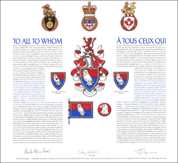 Concession d’armoiries, d’un drapeau et d’un insigne, avec brisures à Elizabeth Anita Hovey et à Samantha Melba Hovey