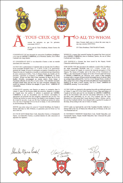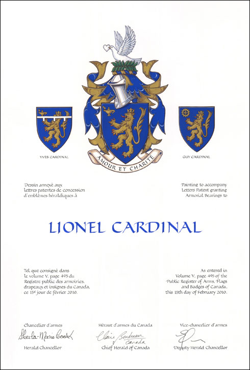 Armoiries de Lionel CardinalBlasonD’azur au lion ceint d’une couronne de fleurs de lis et de feuilles d’érable, accompagné au canton dextre d’une lampe à l’ancienne allumée, le tout d’or; SymbolismeLa couleur bleue et le lion d’or rappellent les armoiries de la famille Le Roux de la région du Poitou, en France, lieu d’origine des ancêtres de M. Cardinal. François Leroux dit Cardinal, l’ancêtre de M. Cardinal, est arrivé en Nouvelle-France en qualité de soldat du régiment de Carignan-Salière. La couronne de fleurs de lis et de feuilles d’érable représente le Canada et le Québec, pays et province de résidence de M. Cardinal. La lampe à l’huile est un symbole du métier d’infirmier, que M. Cardinal a pratiqué pendant plus de trente ans. |