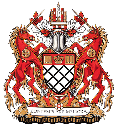 SupportsBlasonDeux licornes de gueules, armées, crinées, onglées et chargées chacune sur l’épaule d’un astrolabe, le tout d’or, debout sur un monticule herbeux du même orné de deux pieds de gueules ailés de sable, le tout soutenu d’une burèle ondée du même inscrite de zéros et de uns d’or; SymbolismeAnimal fantastique, la licorne incarne les rêves, la projection dans le futur et l’imagination. Symbole chrétien et emblème de pureté, elle peut symboliser l’intégrité et la fidélité. Leur couleur rouge représente le Canada. Les astrolabes sur leur épaule illustrent la notion d’exploration, y compris l’exploration intellectuelle. Ils évoquent l’histoire du Canada, et en particulier Samuel de Champlain, qui utilisa un astrolabe de ce type. Les pieds ailés, attribut d’Hermès, représentent l’activité physique, la mise en forme et les sports, en plus d’être un symbole de communication. La bande ondée ornée de zéros et de uns illustre la circulation de l’information, la communication numérique et les médias modernes. |