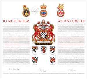 Informations additionnellesCréateur(s)Concept original de Claire Boudreau, héraut d'armes du Canada, assistée par les hérauts de l'Autorité héraldique du Canada Artiste-peintreCathy Bursey-Sabourin CalligrapheShirley Mangione Type de récipiendaireIndividuel Statut spécialGouverneur général |