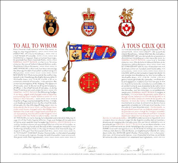 Insigne de Randall Scott EchlinBlasonUn tourteau de gueules liséré d’or chargé d’une balance environnée de quatre feuilles d’érable posées en croix et de quatre besants, le tout du même; SymbolismeLe disque rouge symbolise la carrière de M. Echlin en tant que juge de la Cour supérieure de justice. Sa couleur est celle de la parementure des robes des juges de cette cour. La balance représente la pratique du droit alors que les feuilles d’érable symbolisent le Canada. Les rondelles dorées Les disques blancs rappellent le prix « homme de l’année » décerné à M. Echlin au Temple de la renommée du baseball canadien et musée. |