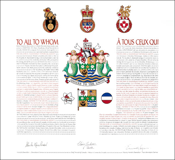Armoiries de The Sir John A. Macdonald Historical SocietyBlasonÉcartelé, au un d’argent au lion de gueules, au deux d’or à une main dextre coupée au naturel posée en fasce tenant une croix recroisettée au pied fiché d’azur, au trois d’or à une nef de sable aux voiles ferlées et mue par des rames du même, ses pennons de gueules, au quatre burelé-ondé d’argent et d’azur au saumon nageant au naturel, à la fasce bretessée de sinople brochante chargée d’une feuille d’érable d’or accostée de deux fleurs de cornouiller d’argent boutonnées d’or; SymbolismeInspirées des armes concédées en 1970 par le roi d’armes Lord Lyon à la mémoire de sir John A. Macdonald, les armoiries sont celles du chef du clan Macdonald de Sleat, auxquelles a été ajoutée une bande horizontale de couleur verte. Cette bande est ornée de deux fleurs de cornouiller, emblème floral de la Colombie-Britannique, ainsi que d’une feuille d’érable qui représente le Canada. Les bordures crénelées de la bande la font ressembler à une voie ferrée, rappelant le chemin de fer transcontinental, legs de sir John A. Macdonald ayant joué un rôle prédominant dans le développement de la Colombie-Britannique. |