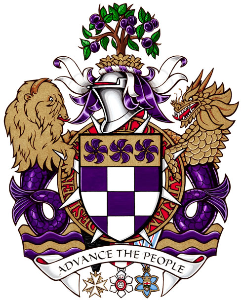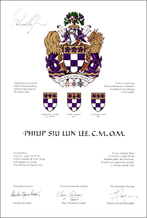 Armoiries de Philip Siu Lun LeeBlasonCinq points de pourpre équipolés à quatre d’argent, au chef d’or chargé de trois fleurs de bauhinia de pourpre; SymbolismeLe motif en échiquier de neuf pièces rappelle la place occupée par Son Honneur dans sa famille, dont il est le neuvième enfant. Les fleurs de bauhinia symbolisent Hong Kong, lieu de naissance de Son Honneur et de son épouse Anita. Leur nombre représente leurs trois enfants. Le pourpre est la couleur préférée de Son Honneur. |