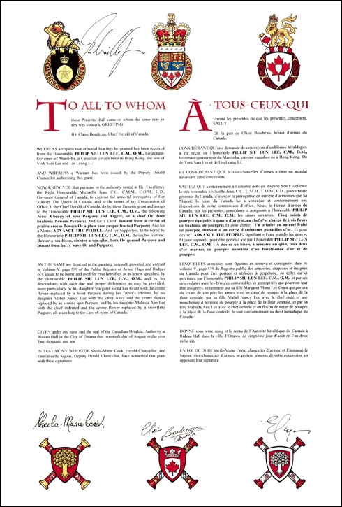 Armoiries brisées de Margaret Mona Lee Grant, fille de Philip Siu Lun LeeBlasonLes armoiries de Philip Siu Lun Lee brisées d'un cœur de pourpre à la place de la fleur centrale; cet individu héritera des armoiries du récipiendaire après son décès; SymbolismeLes figures centrales en chef (cœur, moucheture d’hermine et flocon de neige) indiquent dans le système héraldique canadien l’ordre de naissance respectif des trois filles de Son Honneur. |