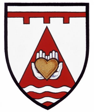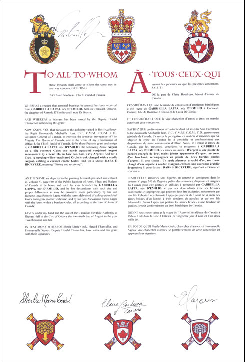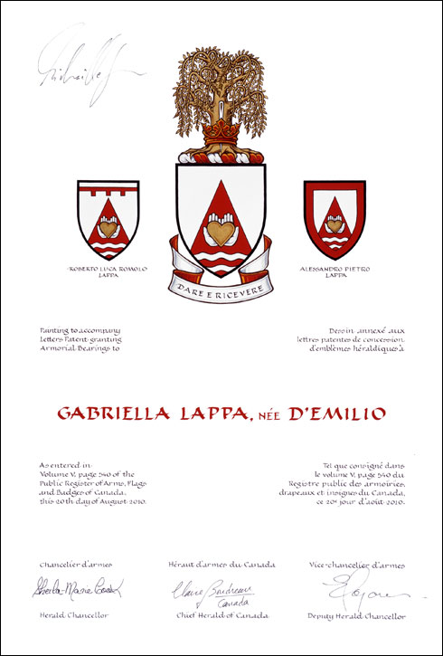 Armoiries de Gabriella Lappa, née d'EmilioBlasonD’argent à une pointe de gueules chargée de deux mains jointes appaumées d’argent, au cœur d’or brochant, accompagnées en pointe de deux burèles ondées d’argent; SymbolismeLes mains représentent les deux fils de Mme Lappa et symbolisent les actions de donner, de créer, de nourrir et de protéger. Le cœur représente la vie de même que l’amour et la loyauté de Mme Lappa pour sa famille et ses amis. Les bandes ondulées évoquent la mer Adriatique et par conséquent ses racines familiales dans la région italienne des Abruzzes. Elles symbolisent aussi le voyage outre-mer entrepris par sa famille et de celle de son mari pour venir s’établir au Canada. La forme triangulaire rappelle la chaîne de montagnes des Apennins, dans la région italienne de la Marche, d’où sont originaires Mme Lappa et son mari. La couleur blanche du champ, symbole chrétien de lumière et de joie, illustre sa foi et sa spiritualité. |