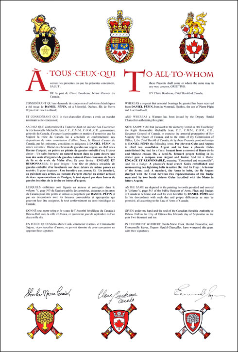 Armoiries de Daniel PépinBlasonDivisé en chevron de gueules sur argent, en chef deux flocons d’argent, en pointe un phénix de gueules embelli d’or; SymbolismeLe blanc et le rouge sont repris des armoiries des différents lieux de résidence de M. Pépin, soit Laval et Montréal, et de ceux de ses ancêtres, originaires de Saint-Laurent-de-la-Barrière, situé dans le département de Charente-Maritime, dans la région du Poitou-Charentes, en France. Le rouge et le blanc sont les couleurs héraldiques de l’Ordre de Saint-Jean au Canada (Prieuré du Canada), au sein duquel M. Pépin est très impliqué. La pointe forme une montagne enneigée et évoque ses vingt ans de service comme patrouilleur sur skis de l’Ambulance Saint-Jean. Elle représente aussi un sommet, un but à atteindre. M. Pépin cherche toujours à donner le meilleur de lui-même et à accéder au sommet dans tout ce qu’il entreprend. Les flocons de neige rappellent son sport favori, le ski alpin; leur nombre ses deux fils. Le phénix, animal mythique qui renaît de ses cendres, incarne sa force de caractère. M. Pépin est toujours prêt à faire face aux adversités et il n’a pas peur des responsabilités, qu’il voit comme un défi. |
