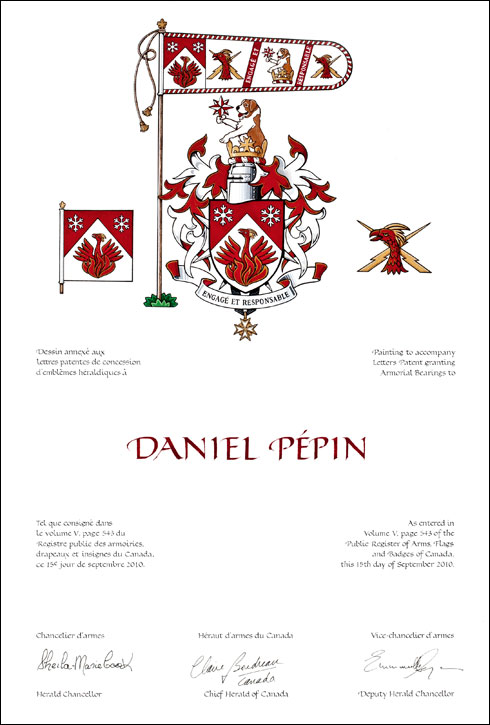 DeviseBlasonENGAGÉ ET RESPONSABLE; SymbolismeLa devise témoigne de l’implication de M. Pépin dans tout ce qu’il entreprend et de son sens du devoir. |