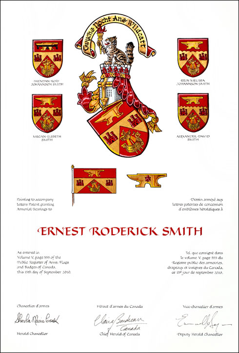 Concession d'armoiries, d'un drapeau et d'un insigne, avec brisures à Brendan Rory Johannson Smith, à Erin Melissa Johannson Smith, à Megan Elsbeth Smith et à Alexander David Smith