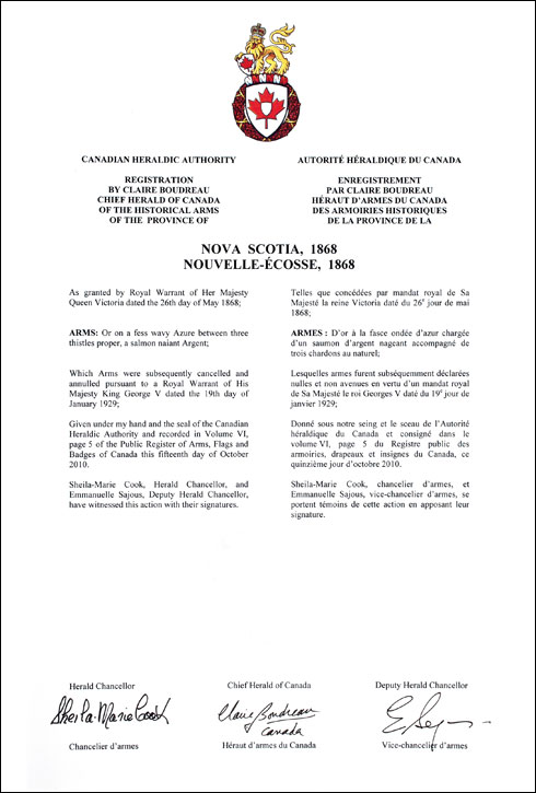 Armoiries historiques de la Province de la Nouvelle-ÉcosseBlasonD’or à la fasce ondée d’azur chargée d’un saumon d’argent nageant accompagné de trois chardons au naturel; SymbolismeLes chardons, emblèmes de l’Écosse, symbolisent, tout comme le nom de la province, les liens historiques qui unissent l’Écosse et la Nouvelle-Écosse. Le saumon représente l’importance de l’industrie de la pêche pour la province. |