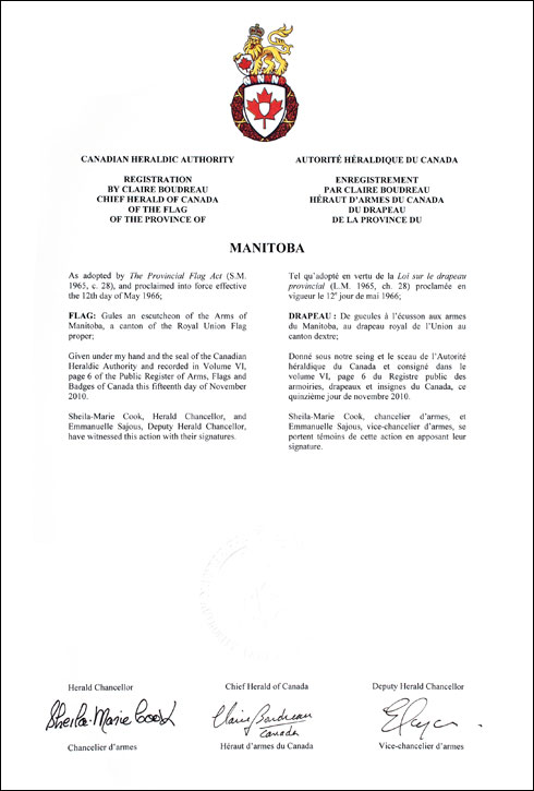 Autres renseignementsLe drapeau a été adopté en vertu de la Loi sur le drapeau provincial (L.M. 1965, ch. 28), proclamée en vigeur le 12 mai 1966. |