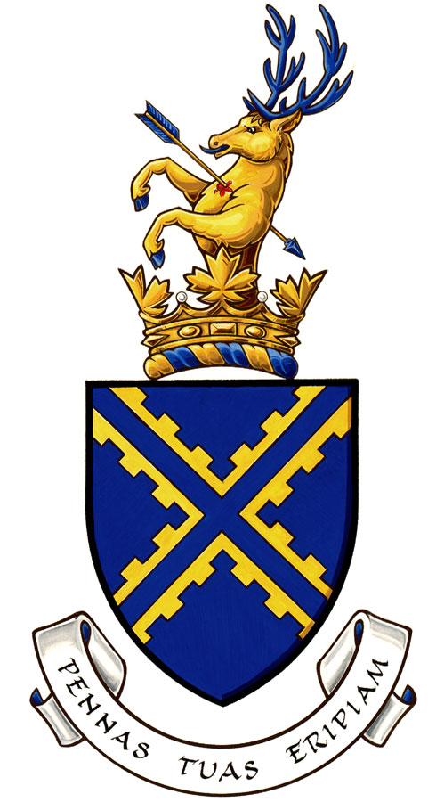 CimierBlasonUn cerf d’or ramé et onglé d’azur, blessé de gueules par une flèche d’or empennée et barbée d’azur et naissant d’une couronne érablée d’or; SymbolismeLe cerf percé d’une flèche rappelle la passion de M. Pitre pour la chasse. |