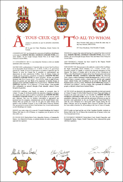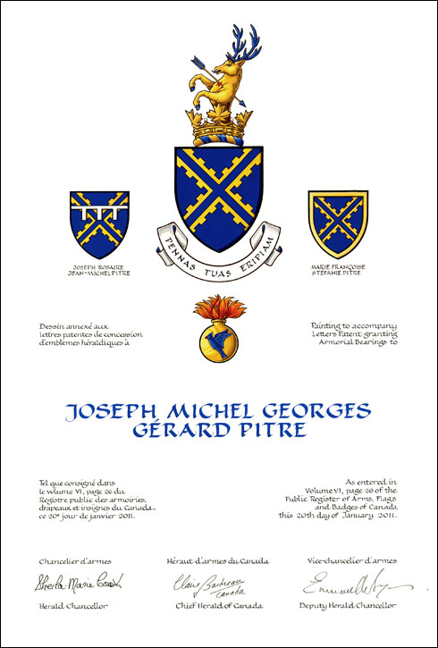 Concession d'armoiries et d'un insigne, avec brisures à Joseph Rosaire Jean-Michel Pitre et à Marie Françoise Stéfanie Pitre