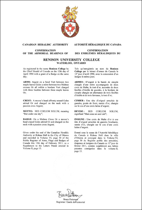 Autres renseignementsLes emblèmes du récipiendaire ont été précédemment consignés au nom de Renison College dans le Registre public des armoiries, drapeaux et insignes du Canada, vol. II, page 15, le 12 avril 1990. |