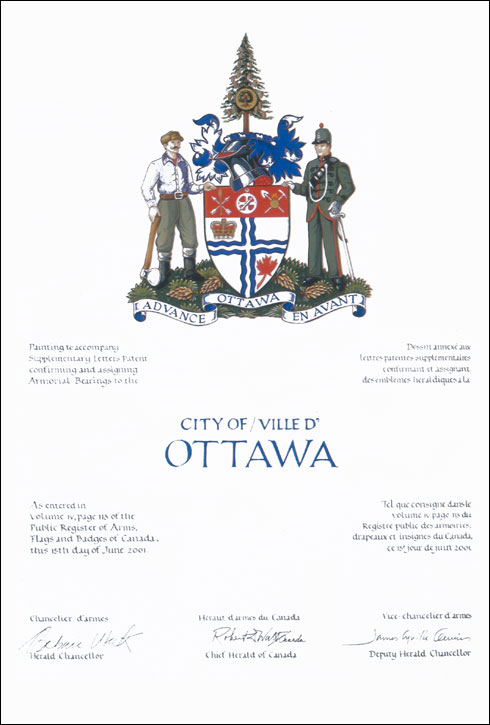 SupportsBlasonÀ dextre, un équarrisseur de bois de 1850 tenant de sa main dextre une hache à équarrir la lame en bas, à senestre, un officier du Civil Service Rifle Regiment, les tenants debout sur un monticule herbeux semé de pommes de pin, le tout au naturel; SymbolismeL’émondeur incarne l’industrie historique du bois d’œuvre à Ottawa. L’officier du Civil Service Rifle Regiment rappelle que ce corps militaire et ses successeurs, formés de volontaires de la fonction publique, ont servi à Ottawa depuis 1865. |