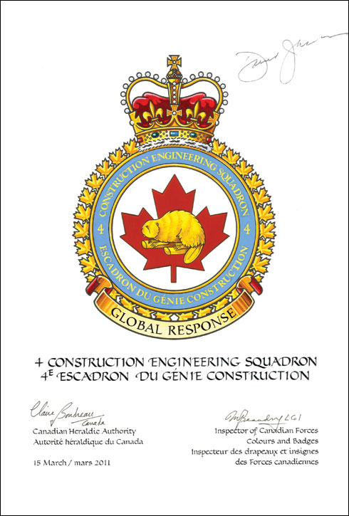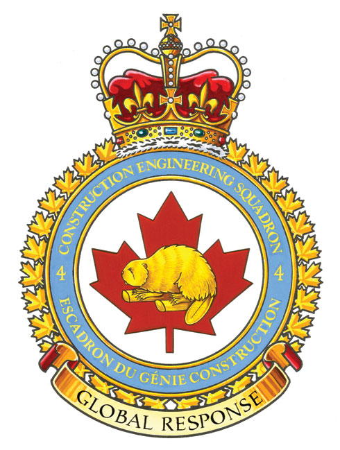 Insigne du 4e Escadron du génie constructionBlasonD’argent à une feuille d’érable de gueules chargée d’un castor soutenu de rondins, le tout d’or; SymbolismeL’insigne comporte les couleurs nationales, le rouge et le blanc. Le service de l’unité à la nation est symbolisé par la feuille d’érable, tandis que le castor est ce qui incarne le mieux le génie militaire canadien et rappelle en même temps l’insigne de l’unité de Construction et maintenance de l’Aviation royale du Canada. La devise évoque la capacité de l’unité d’être déployée partout dans le monde. |