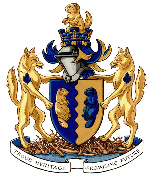 SupportsBlasonDeux coyotes d’or chargés chacun sur l’épaule d’une flamme d’azur et debout sur une digue de castor au naturel soutenue d’eau d’azur; SymbolismeLes coyotes sont des animaux présents dans la région. Les flammes bleues symbolisent l’industrie du gaz naturel. Le barrage de castor reprend la symbolique des armes et souligne l’ingéniosité et le génie des castors qui réinventent sans relâche leur habitat. |