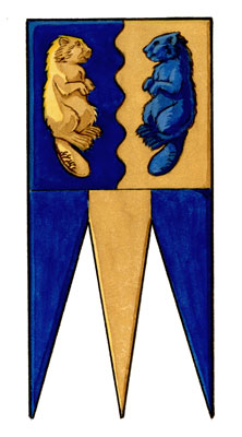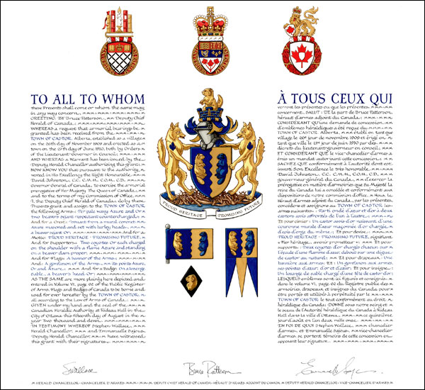 Armoiries de la Town of CastorBlasonParti ondé d’azur et d’or à deux castors assis affrontés de l’un à l’autre; SymbolismeLes castors évoquent le nom de la municipalité et ils sont depuis longtemps utilisés comme symbole municipal. La ligne de division ondée rappelle le ruisseau Castor Creek. |
