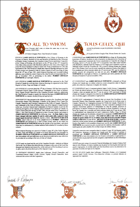 Informations additionnellesCréateur(s)Non disponible Artiste-peintreRobert Grey CalligrapheSans objet Type de récipiendaireIndividuel Autres renseignementsLes emblèmes du récipiendaire ont été précédemment consignés dans les archives de la Cour du Roi d’armes Lord Lyon, Édimbourg, Écosse, le 12 juin 1981. |