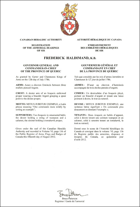 Informations additionnellesCréateur(s)Non disponible Artiste-peintreArtist of the College of Arms, London / Artiste du Collège d’armes, Londres CalligrapheSans objet Type de récipiendaireIndividuel Statut spécialGouverneur général Autres renseignementsLes emblèmes du récipiendaire ont été précédemment consignés dans les archives du Collège d’armes, Londres, Angleterre, 12 juillet 1786. |
