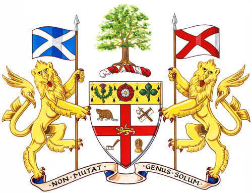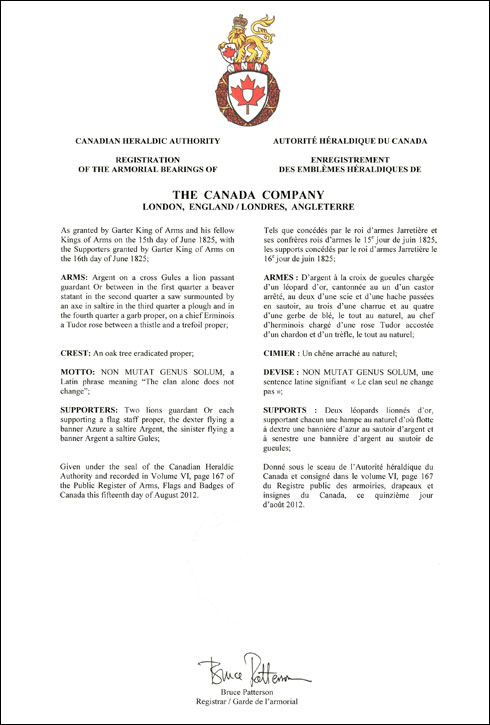 Armoiries de The Canada CompanyBlasonD’argent à la croix de gueules chargée d’un léopard d’or, cantonnée au un d’un castor arrêté, au deux d’une scie et d’une hache passées en sautoir, au trois d’une charrue et au quatre d’une gerbe de blé, le tout au naturel, au chef d’herminois chargé d’une rose Tudor accostée d’un chardon et d’un trèfle, le tout au naturel; SymbolismeNon disponible. |